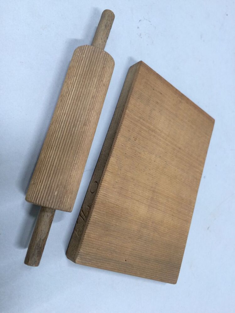 Plisseerinstrument voor neteldoekse rouw floddermutsen, bestaande uit een plankje en een rol, beiden gegroefd