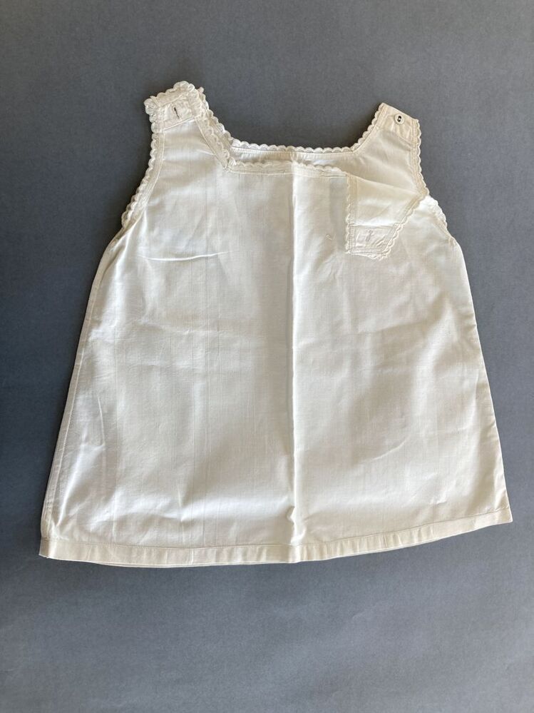 Meisjeshemd van wit katoen, knoopsluiting op de schouders, armsgaten en hals afgewerkt met geschulpt randje, gemerkt N