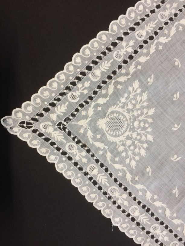 Driekante neteldoek tipdoek met twee open naden, randen met krullend bloemmotief en waaiervormig hoekmotief in tamboereerwerk