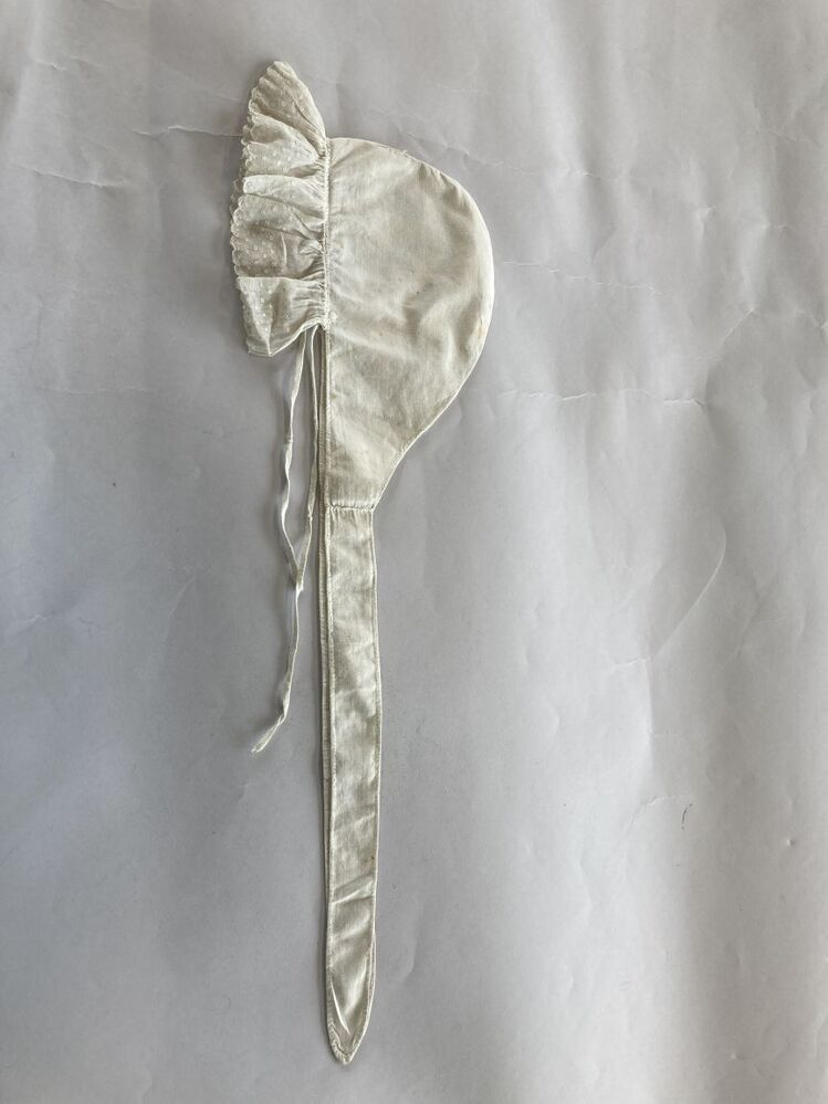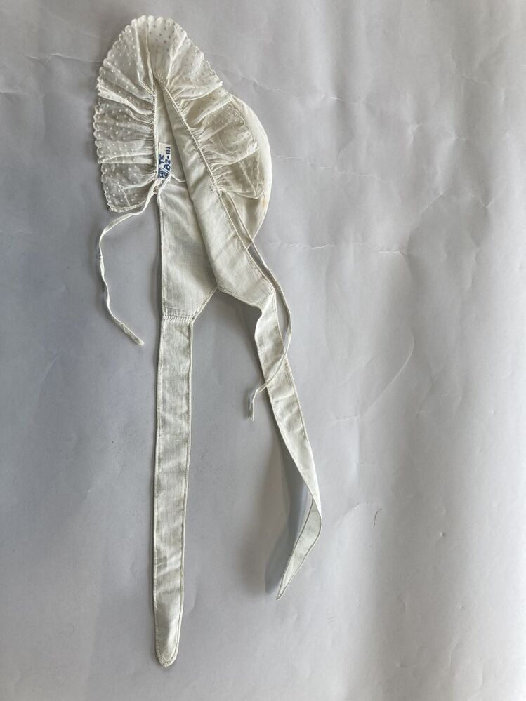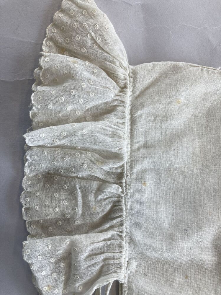 Slaapmuts meisje van katoen en neteldoek met engels borduurwerk op gerimpeld volant van de gezichtzijde