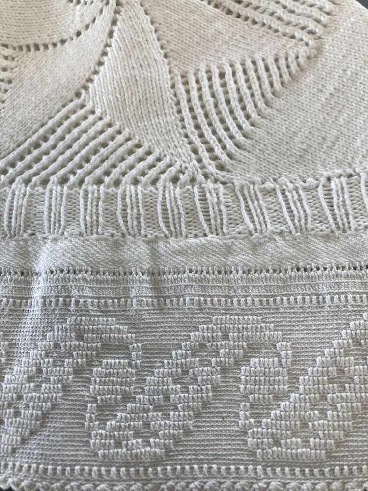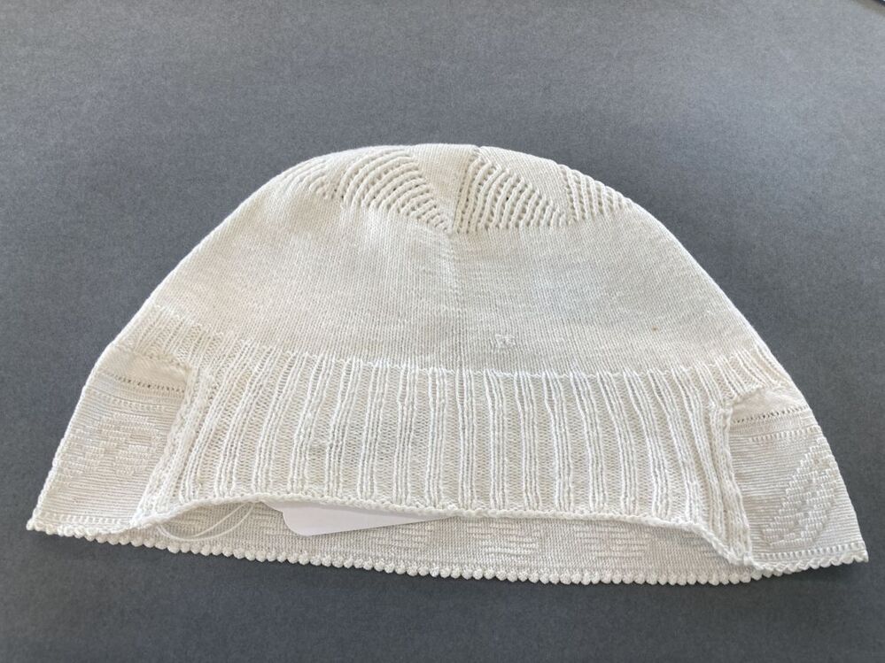 Tipmuts met ajour gebreide bol met ster en gehaakte achterstrook, 'lopende hond' motief