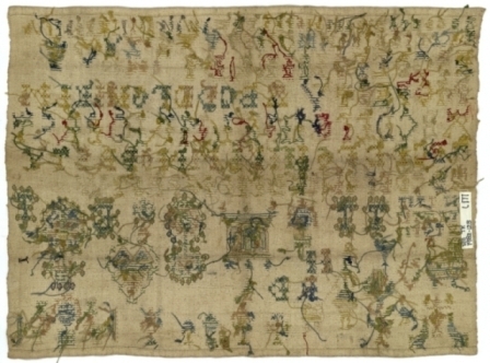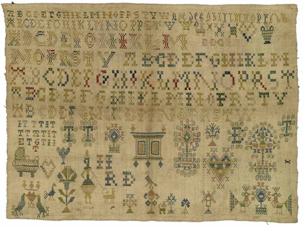 Lettermerklap op grof linnen, met acht alfabetten, gemerkt T.T.