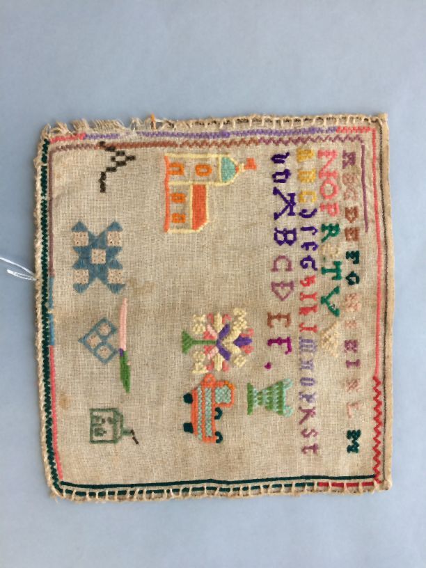 Lettermerklap op stramien, geborduurd met wol en katoen in kruissteek