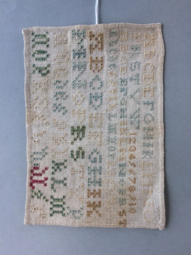 Lettermerklap van linnen, zijden kruissteek en stersteek
