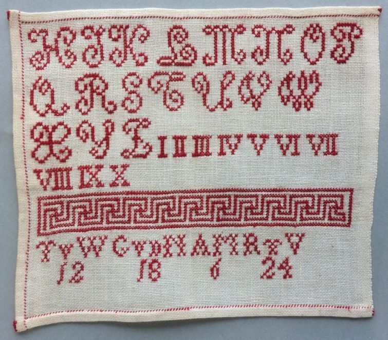 Lettermerklap, katoen, rood kruissteek borduursel, eenmaal alfabet te beginnen met H, Romeinse cijferreeks I t/m X, TvW G vd M AM RvV 12 18 6 24