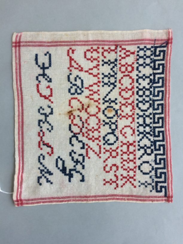 Lettermerklap, katoenen stramien, geborduurd in stersteek, blauw en rood
