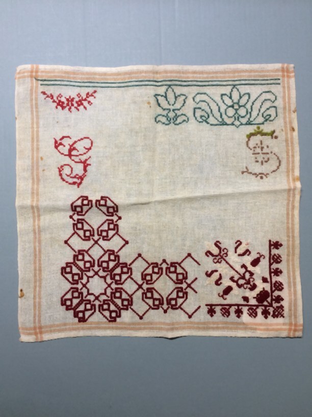 Proeflap borduren op katoen stramien, perlégaren, groen, rood en wit