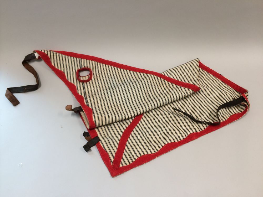 Paardenhoofdkap van blauw-wit gestreept katoen, afgezet en verfraaid met rode baai