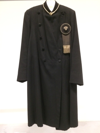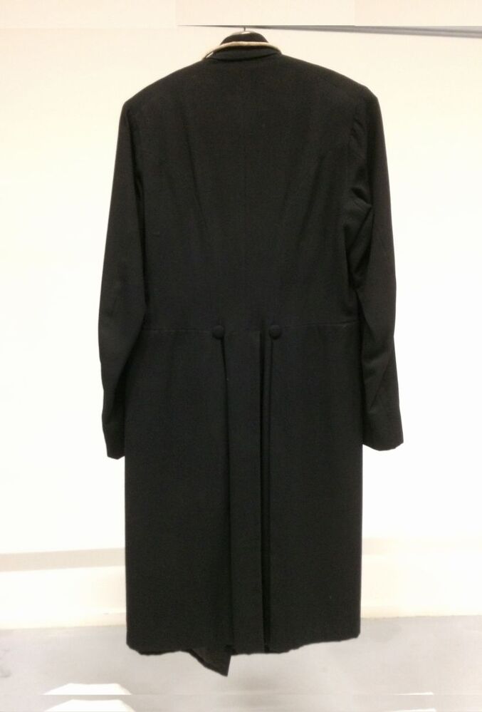 Naar links en rechts overslaande mannenjas van zwarte wol, maakt onderdeel uit van bodekostuum