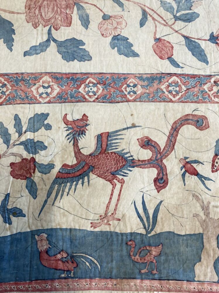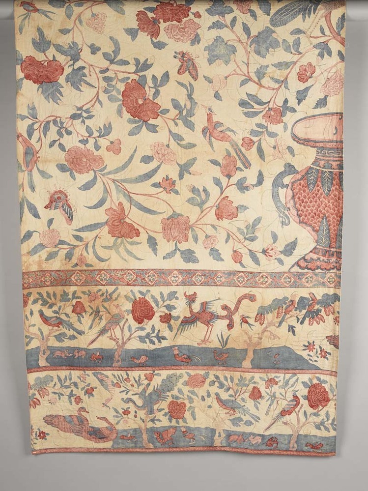 Sitsen bedgordijn met halve bloemvaas met rozenstruik en pauw, onder rand met diverse vogels in boompjes op witte grond