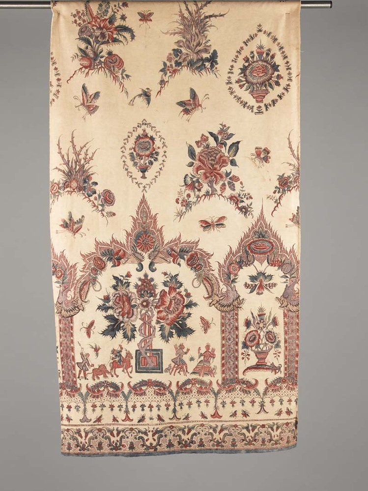 Coupon van sits met beschilderd met een rand met bogen en figuurscènes, erboven grondjes met bloemen en spitsovalen met bloem op witte grond
