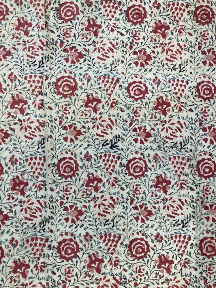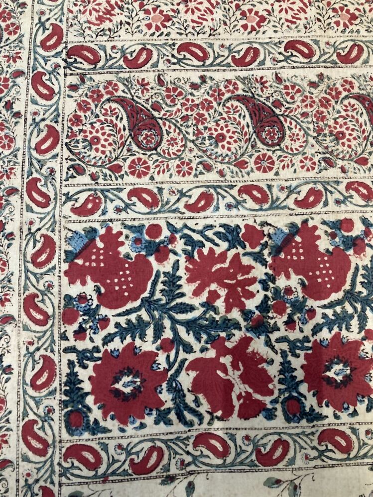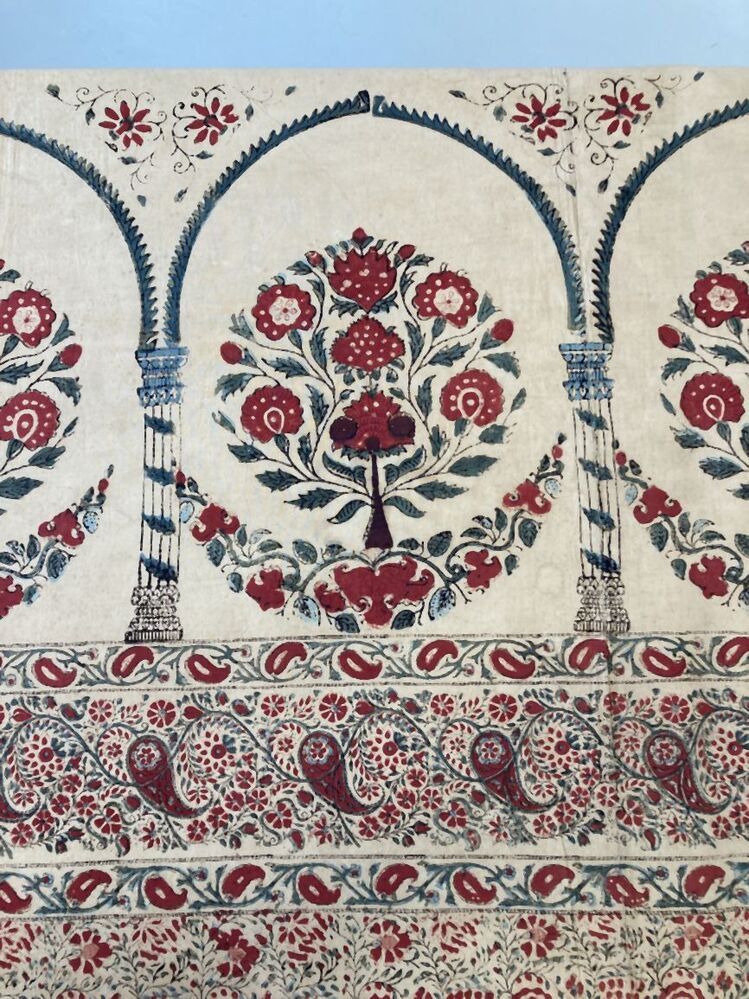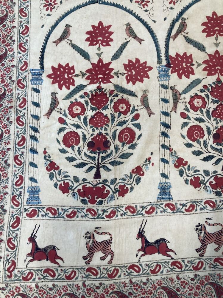 Sitsen palempore met dicht klein bloemmotief op het middenveld, aan de korte zijden een rand met 4 levensboompjes onder een boog en een rand met antilopen en tijgers op witte grond