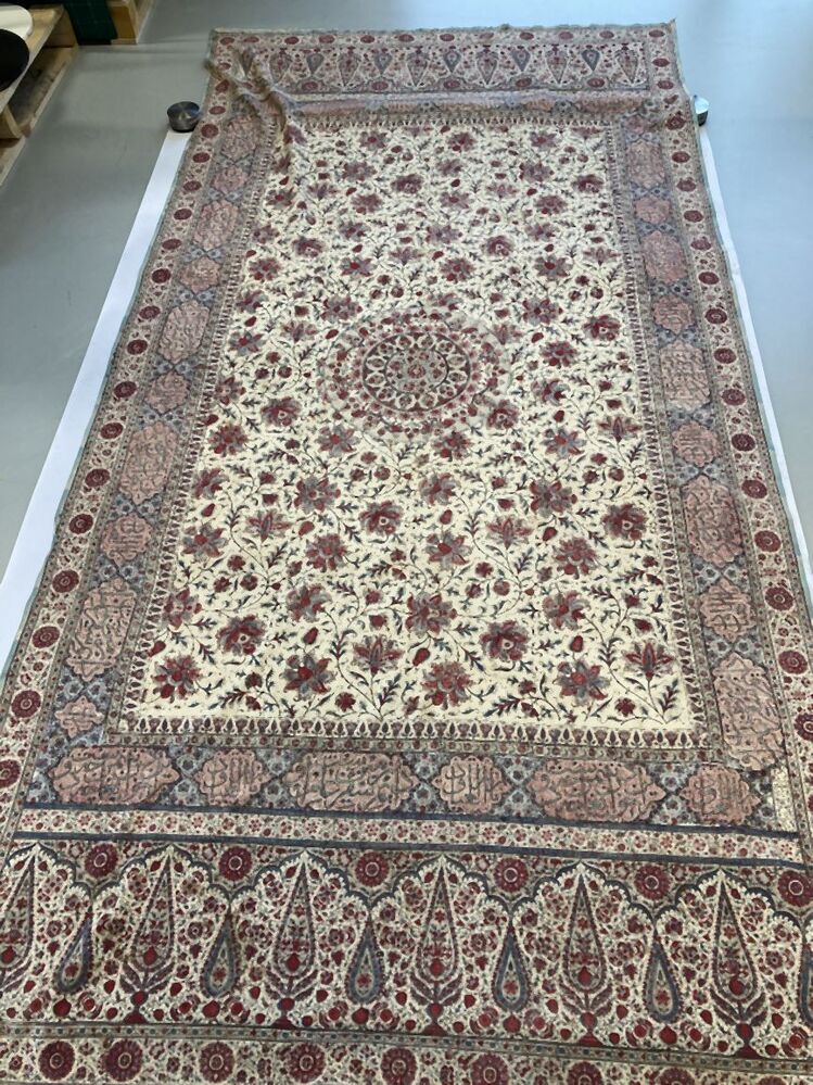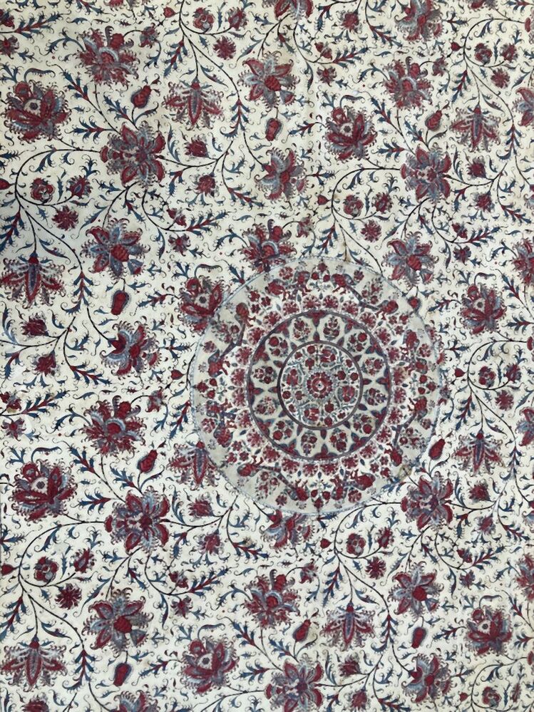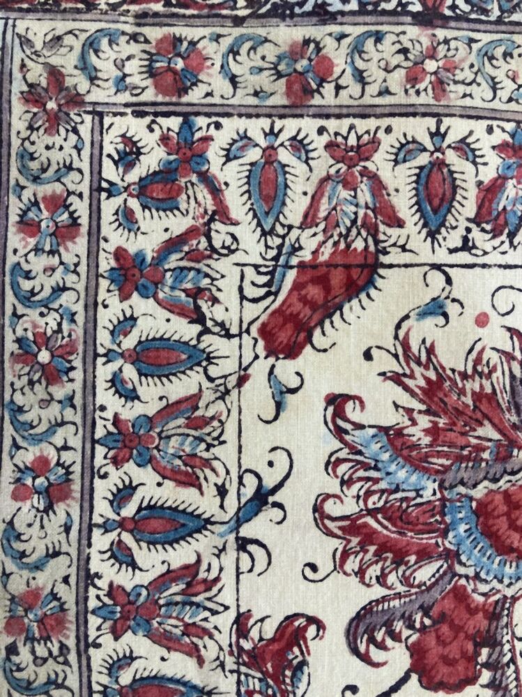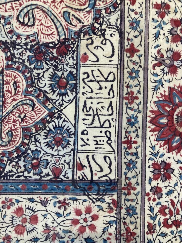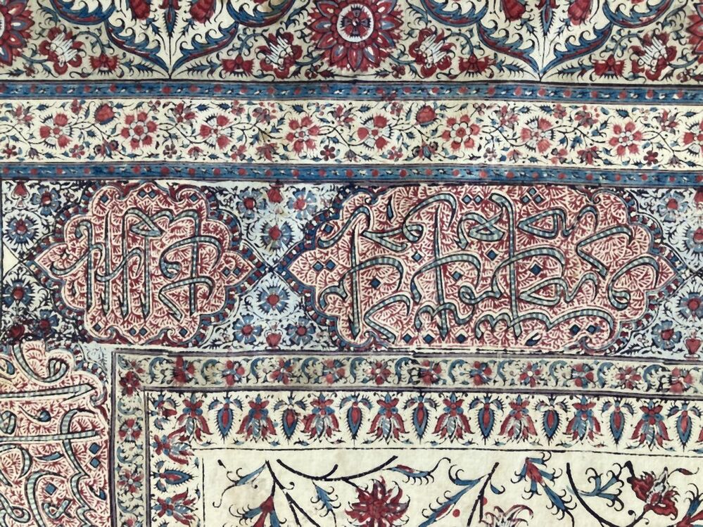 Palempore van bedrukt katoen met middenveld met bloemranken en randen met gestileerde bloemen en schilden met Koefisch schrift op witte grond
