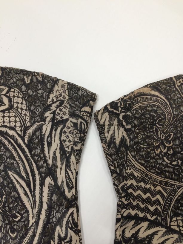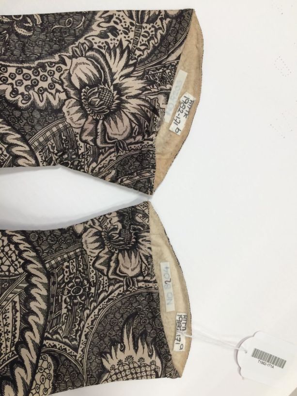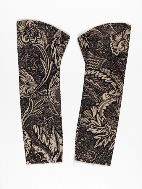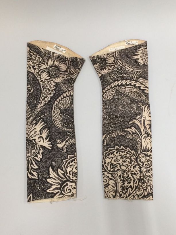 paar Hindelooper sitsen mouwen voor de rouw, met bizar floraal motief op witte grond met rastervulling.