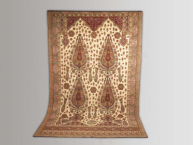Gordijn van sits vier cypres-achtige bomen onder een dubbele boog en rand met schildjes met Koefisch schrift in de rand op witte gron