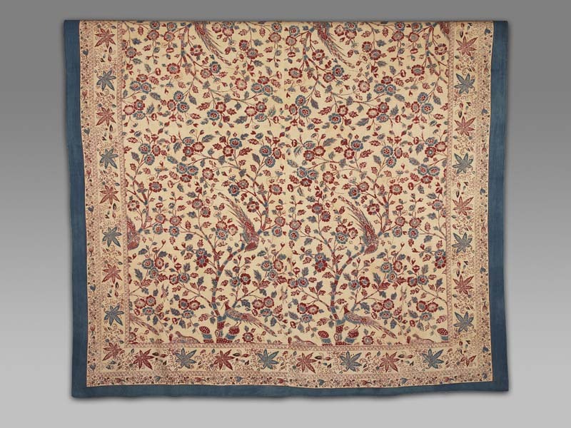 Bedrukt katoenen palempore , het midenveld heeft aan weerszijden twee kronkelende rozenstruiken met vogels, rand met hennepbladeren op witte grond