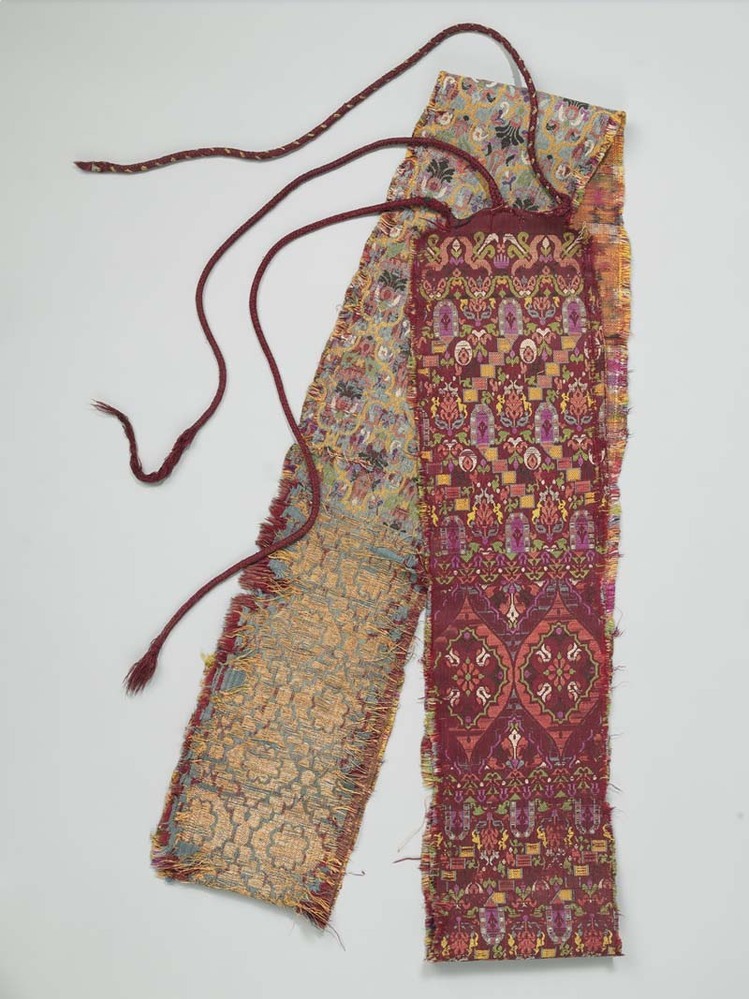 Band of ceintuur van zijde en katoen, zeer ingewikkeld weefsel: dubbel weefsel, satijnbinding, ingeweven figuren, ikat