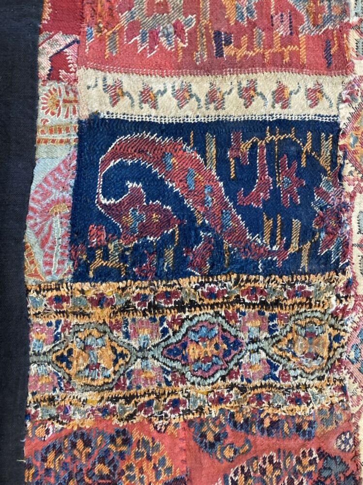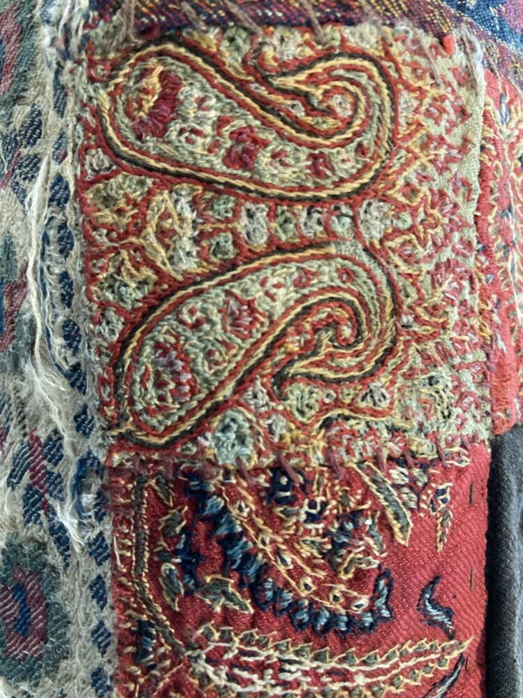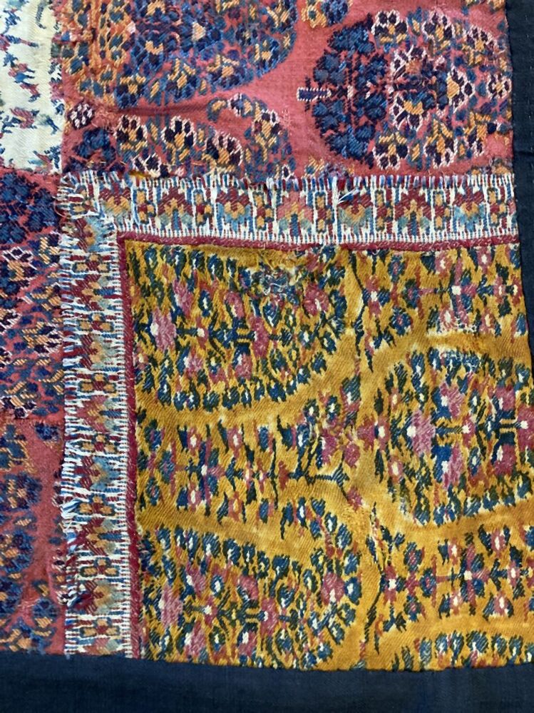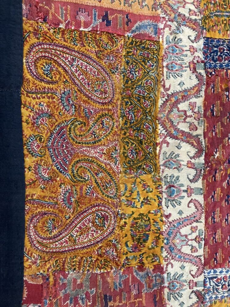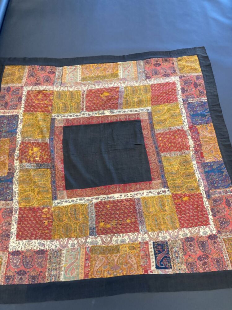 Omslagdoek in patchwork, met zwart vierkant middenveld, hier omheen blokken met kasjmierpatroon