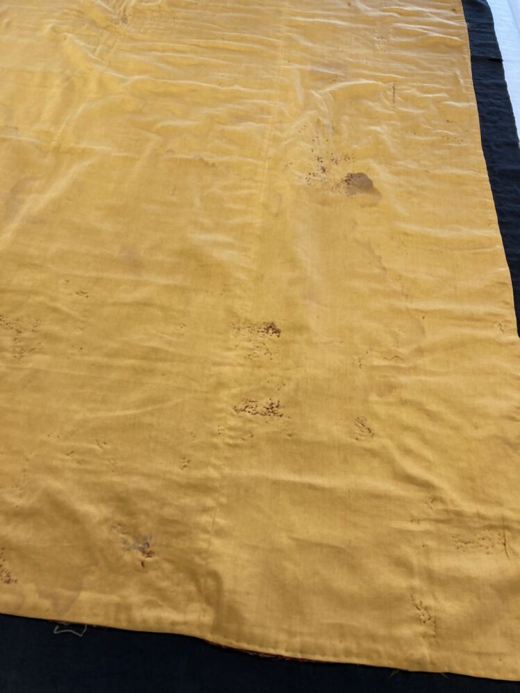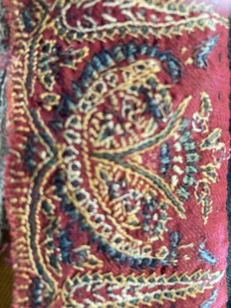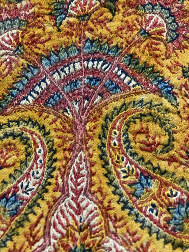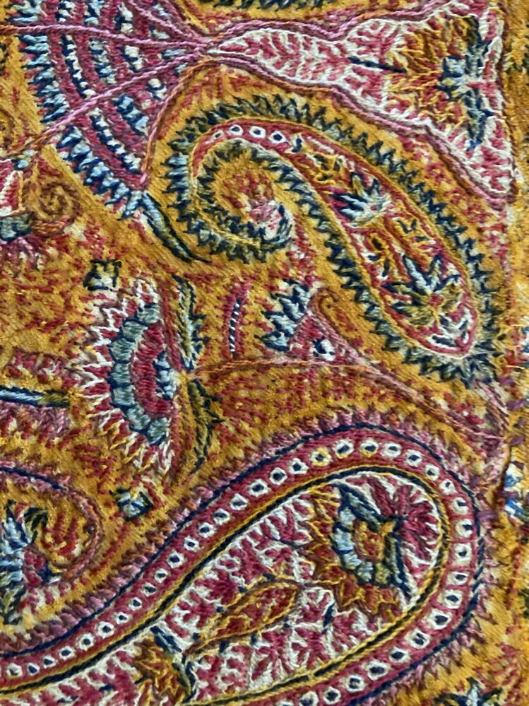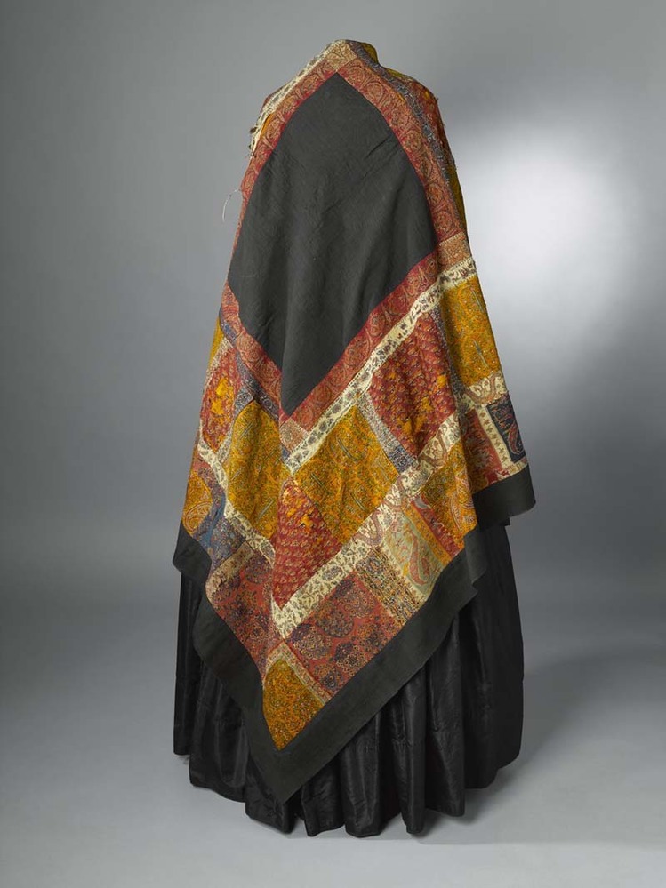 Omslagdoek in patchwork, met zwart vierkant middenveld, hier omheen blokken met kasjmierpatroon