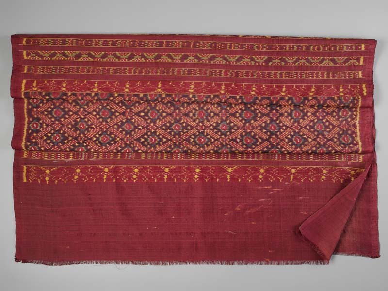Indonesische doek van rode zijde met ikat inslag in de kleuren donkerpaars, groen, geel, blauw en wit
