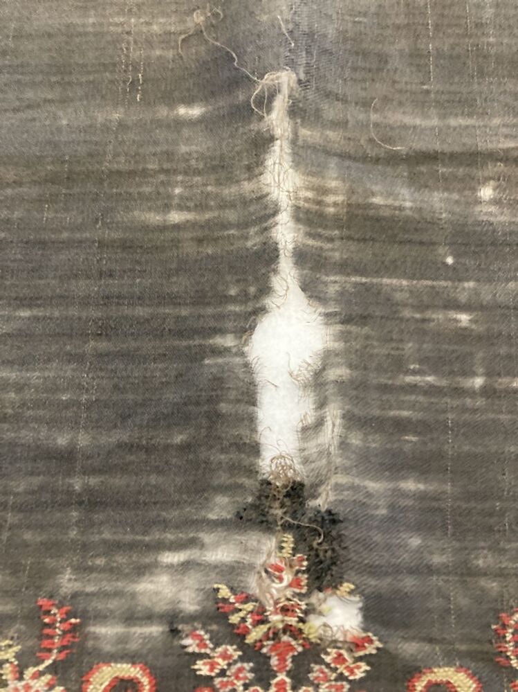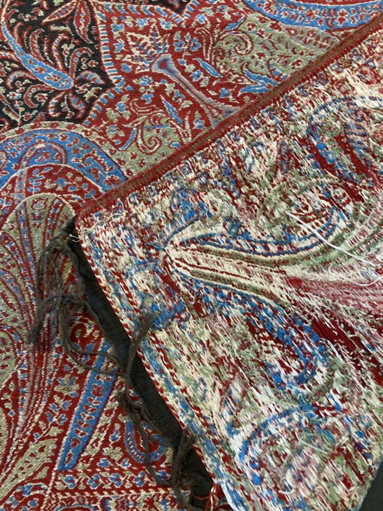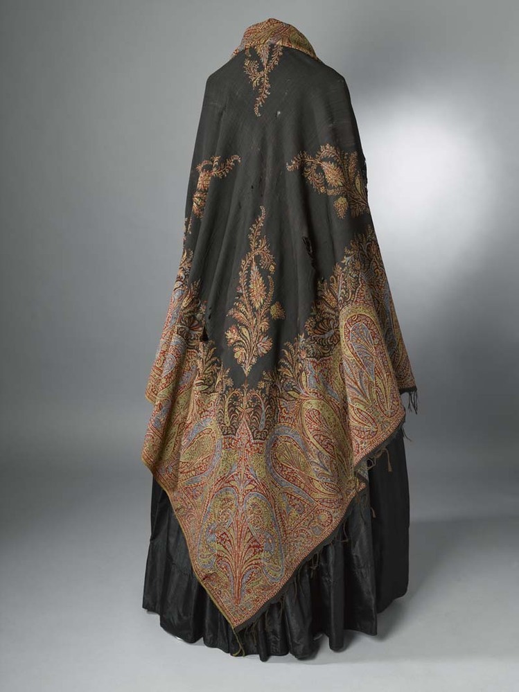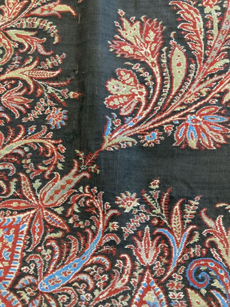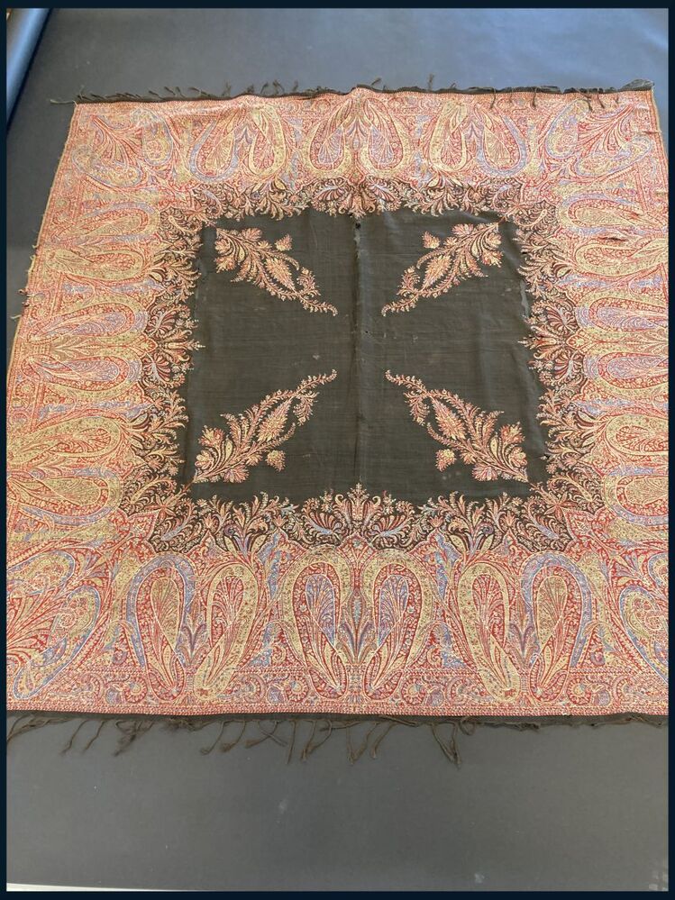 Slingerdoek van zwart kamgaren met ingeweven kasjmier patroon met palmetmotieven