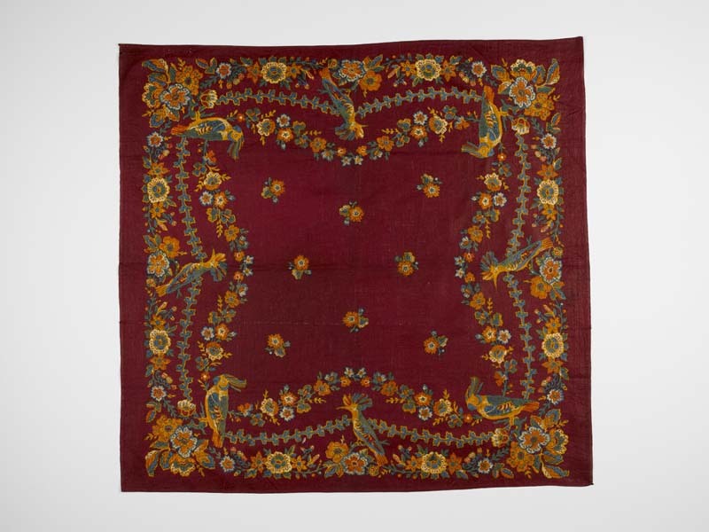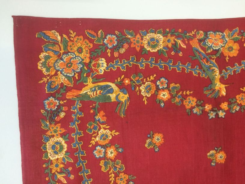 Rode katoenen doek of sjaal bedrukt met papegaai en bloemenrand
