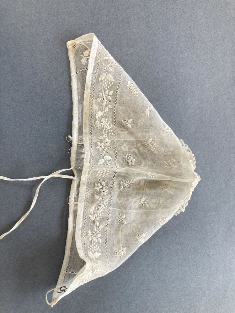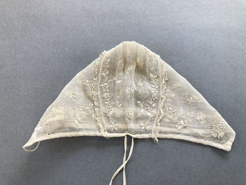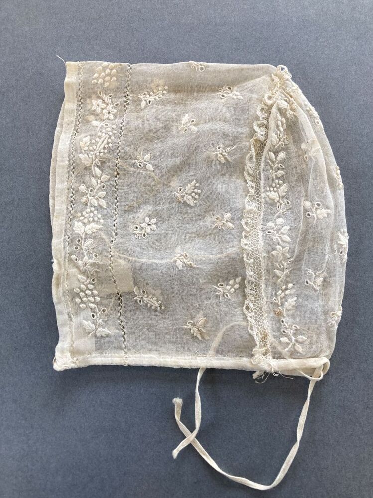 Kindermutsje van neteldoek met frans borduurwerk