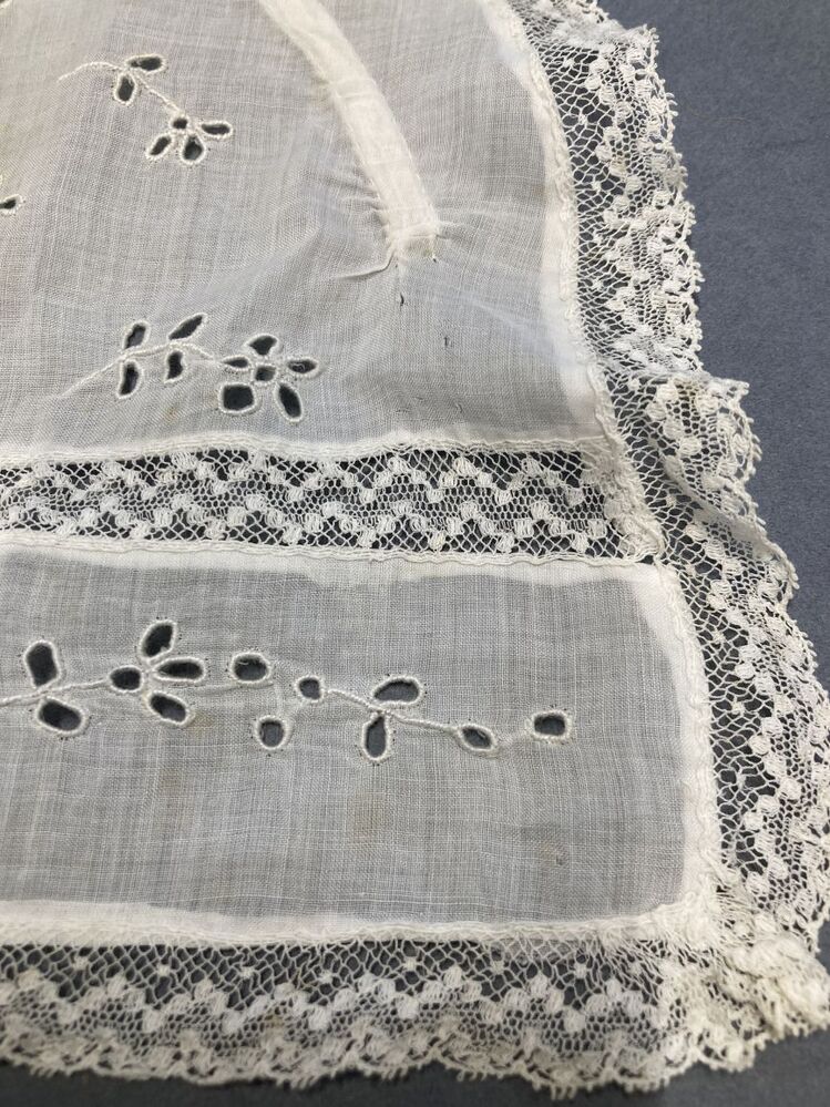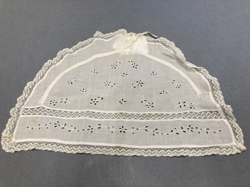 Mutsje in de vorm van een halve cirkel met engels borduurwerk