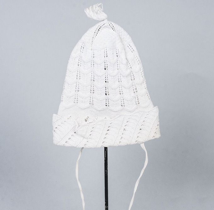 Slaapmuts jongen van wit katoenen breiwerk met ajourrand, diagonaal patroon, bol zigzag patroon, kwastje, onderdeel van groep van drie