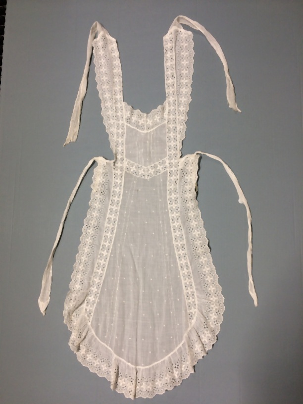 Schortje met bovenstuk van wit katoen en machinaal broderie, katoen batist met noppen