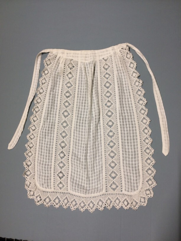 Schortje van wit katoen met ajourblokjes en tussenzetsel en kant van filethaakwerk
