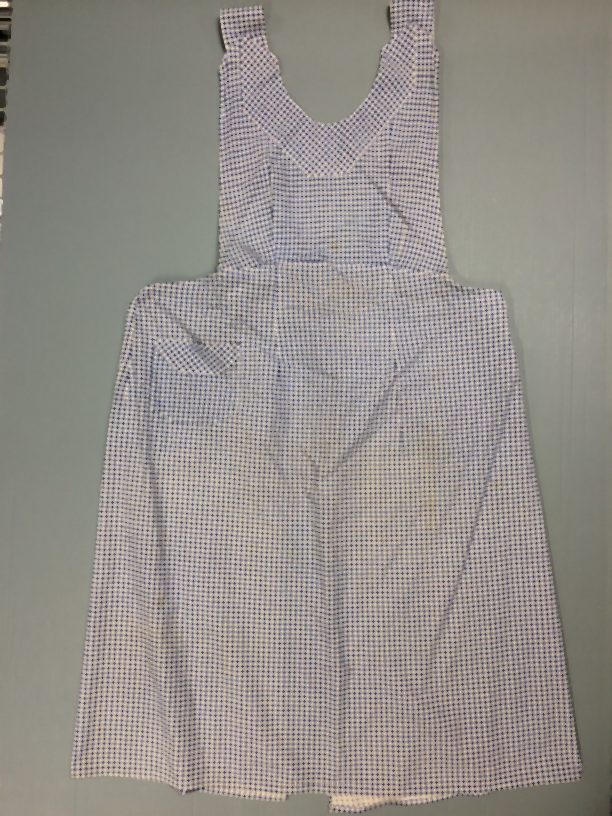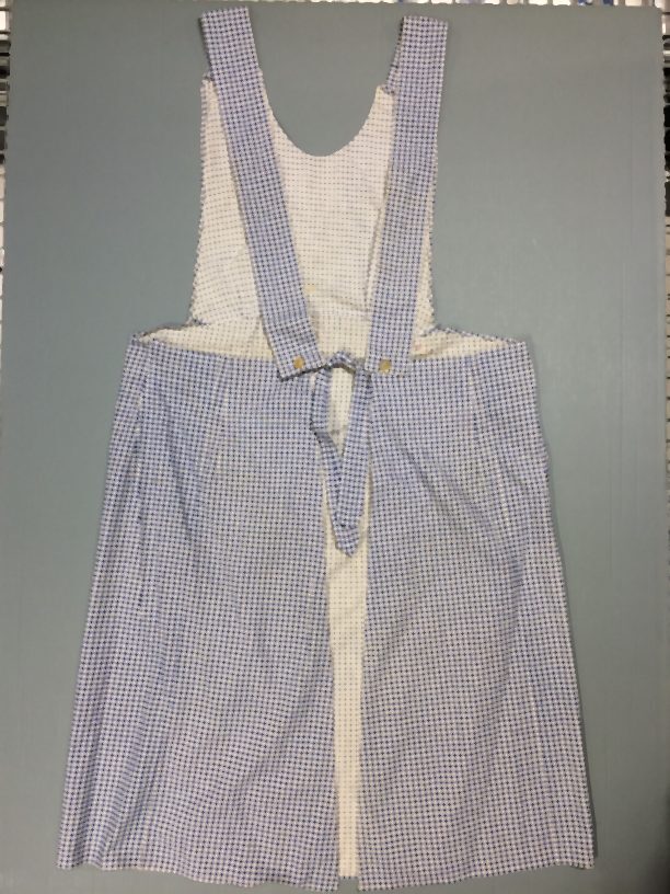 Verpleegstersschort van wit met blauwe ruitjes bedrukte katoen