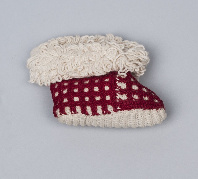 Als proefstuk gebreid babyslofje, onderdeel van groep van vier