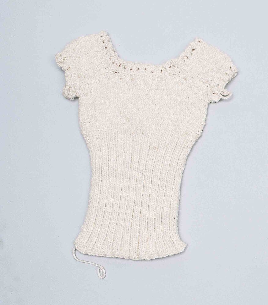 Borstrok zonder mouwen, gebreid proefstuk van wit katoen, onderdeel van groep van twee