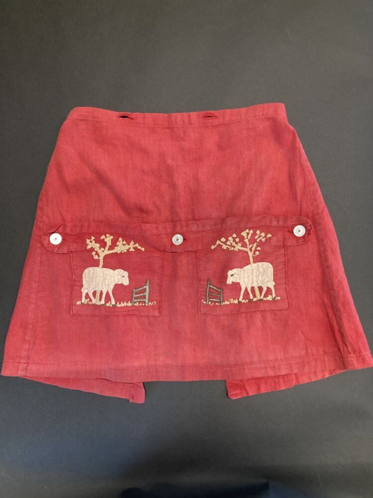 Schortje van rood katoen, borduurwerk op de zakken in de vorm van een schaapje