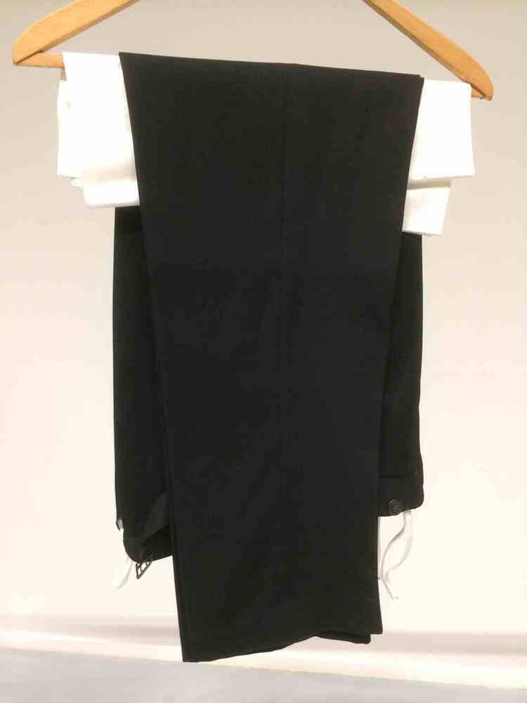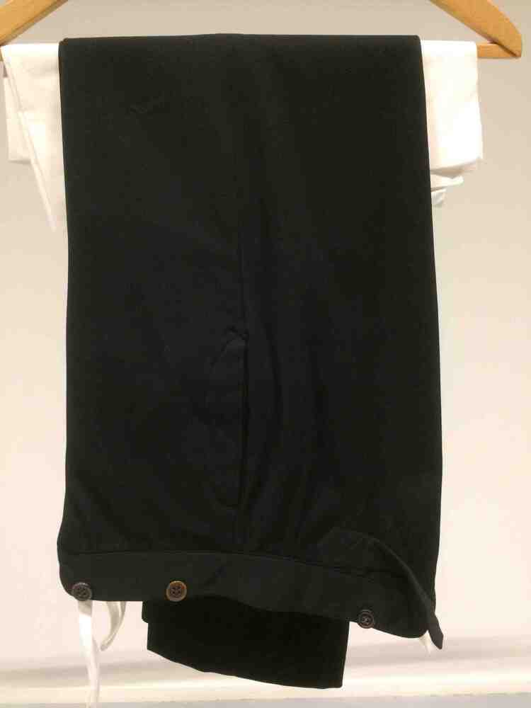 Zwarte lange broek van wol (kamgaren) met gulpsluiting, onderdeel van kostuum