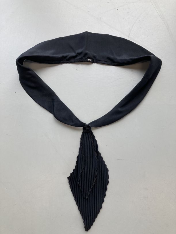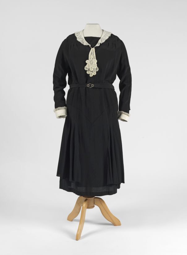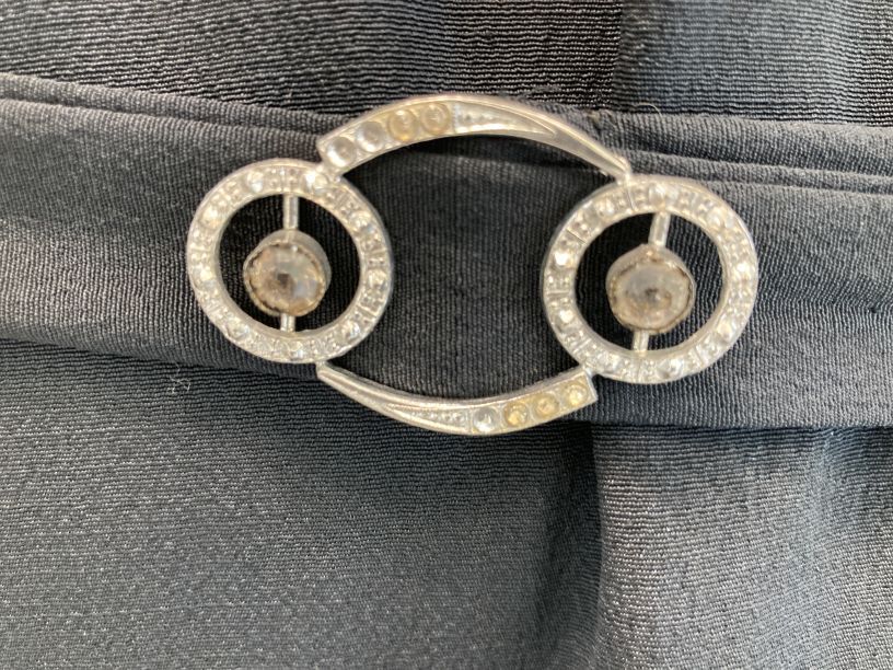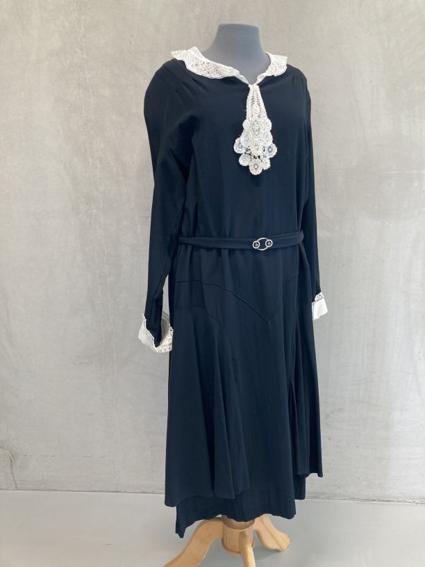 Trouwjurk van zwart wollen crèpe met lange mouw, losse flappen over rok, ceintuur met strass-gesp