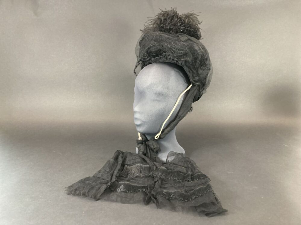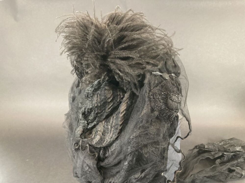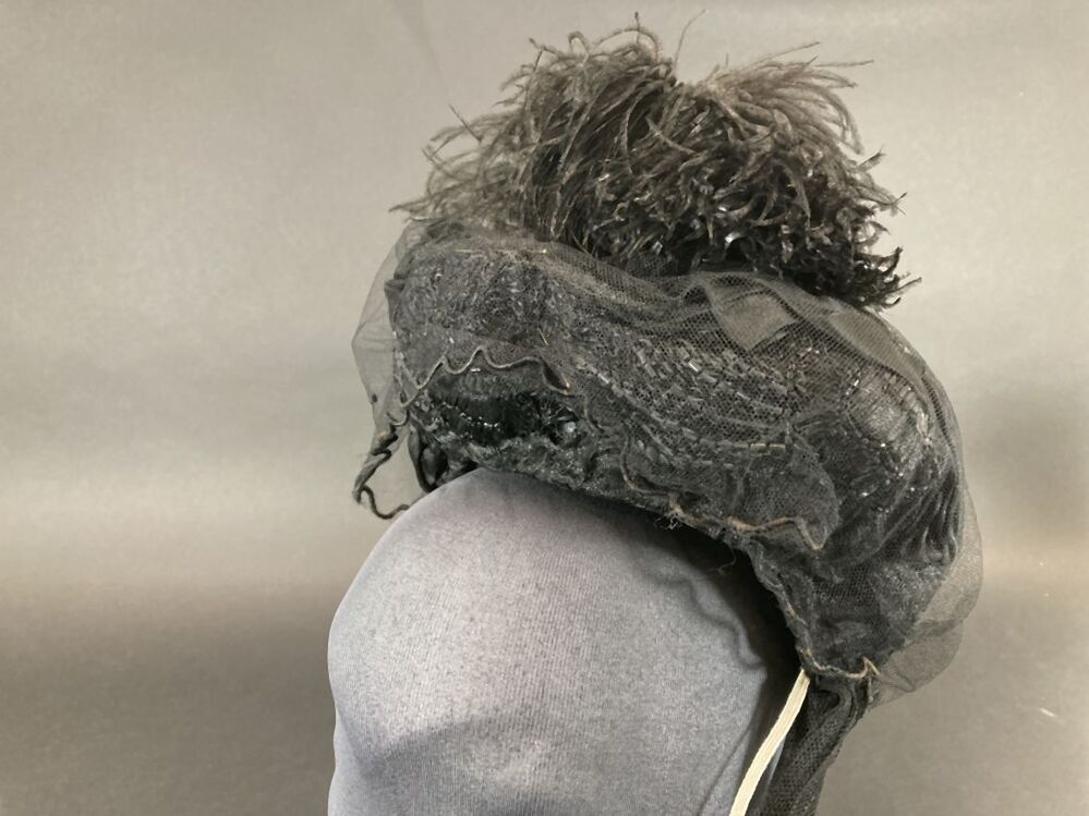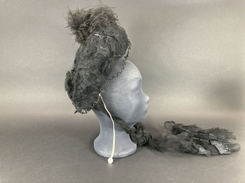 Zwart kypske met gedrapeerd synthetisch materiaal, borduursel op grove en zwarte tulle