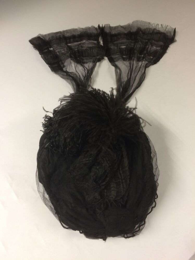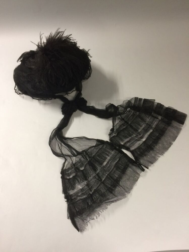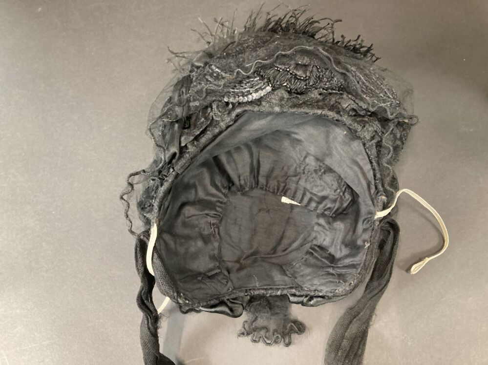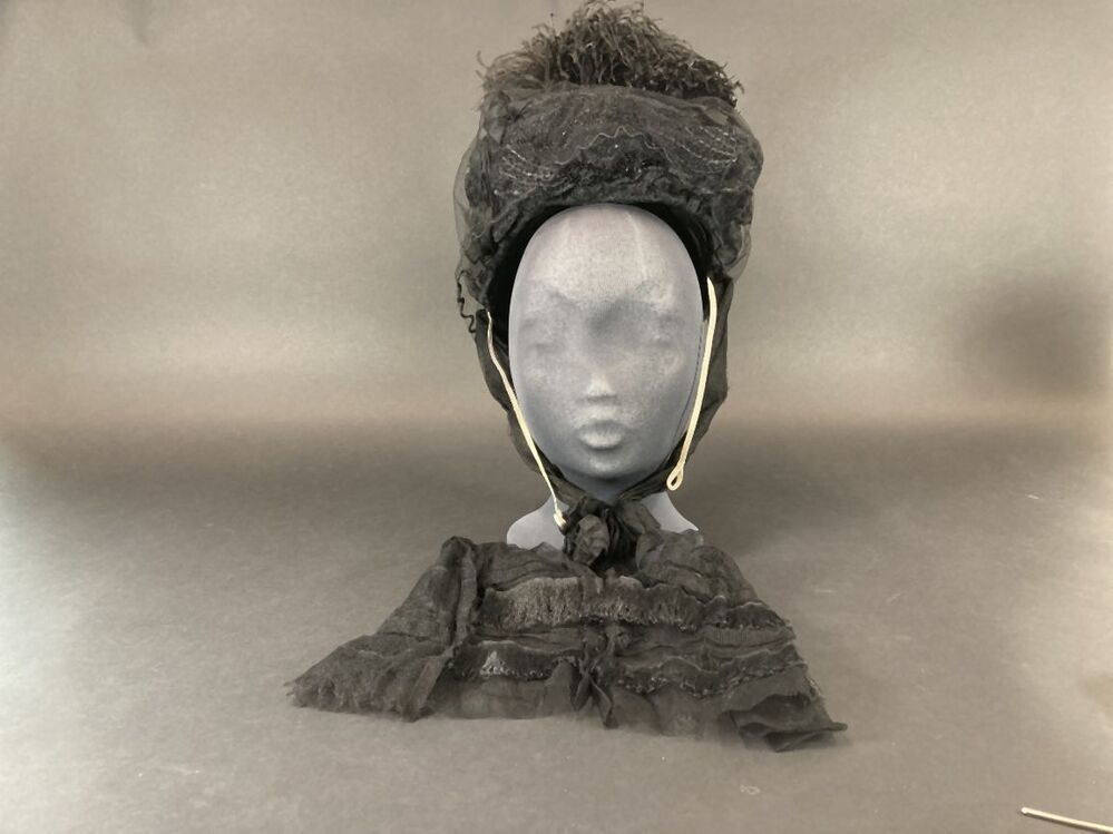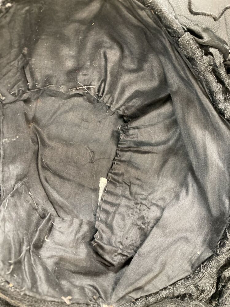 Zwart kypske met gedrapeerd synthetisch materiaal, borduursel op grove en zwarte tulle