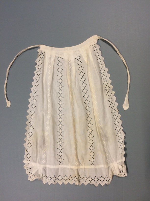 Schortje van machinaal broderie, wit, geschulpte zomen, ajourstrepen
