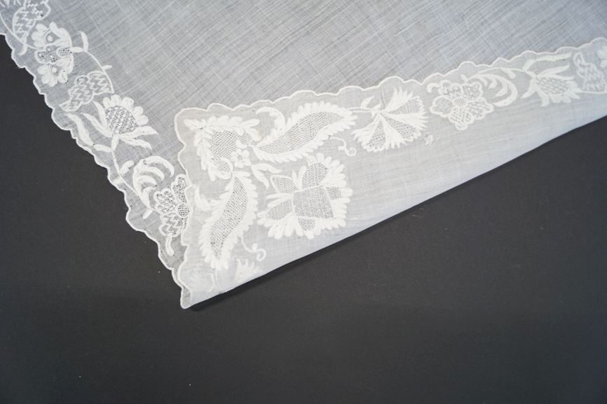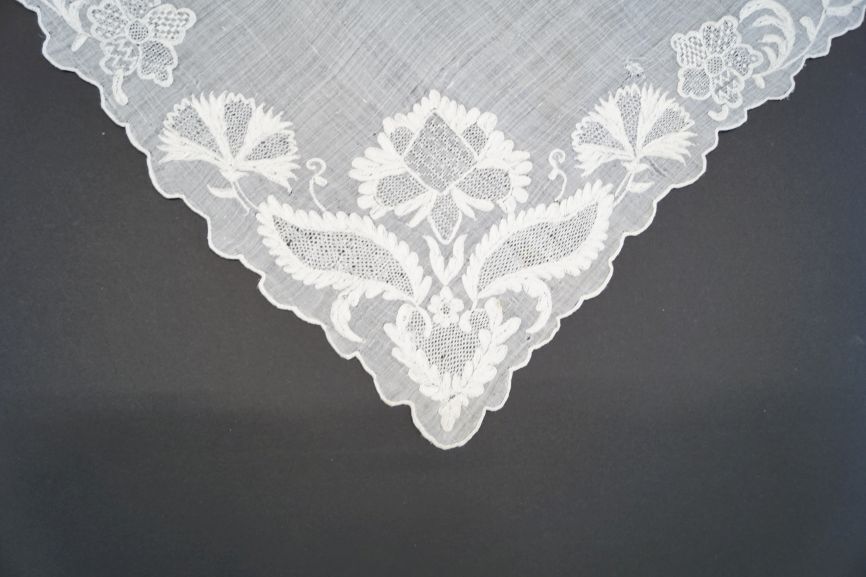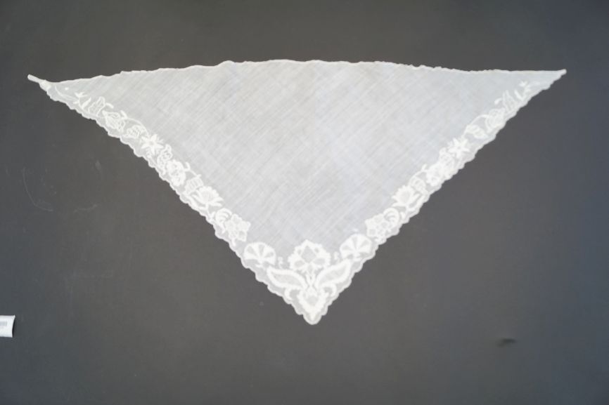 Driekante transparante fichu met in een hoekpunt een symmetrisch bloemmotief in hartvorm en rand met golvende bloemrank
