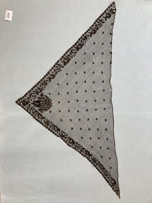 Driekante doek van doorgestopte zwarte tule met hoekmotief, rand en strooimotief