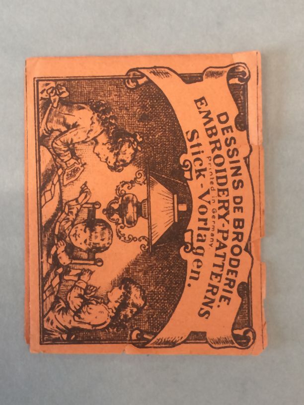 Patronenboekje, kaftje van oranje papier met vouwblad(wit) met kruissteek borduurpatronen, letters en bloemmotieven, Printed in Germany
