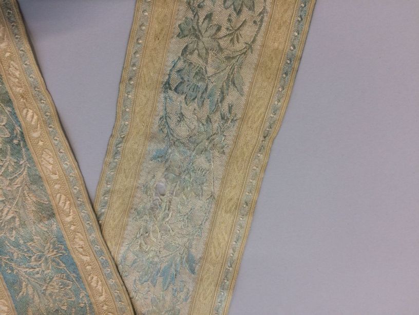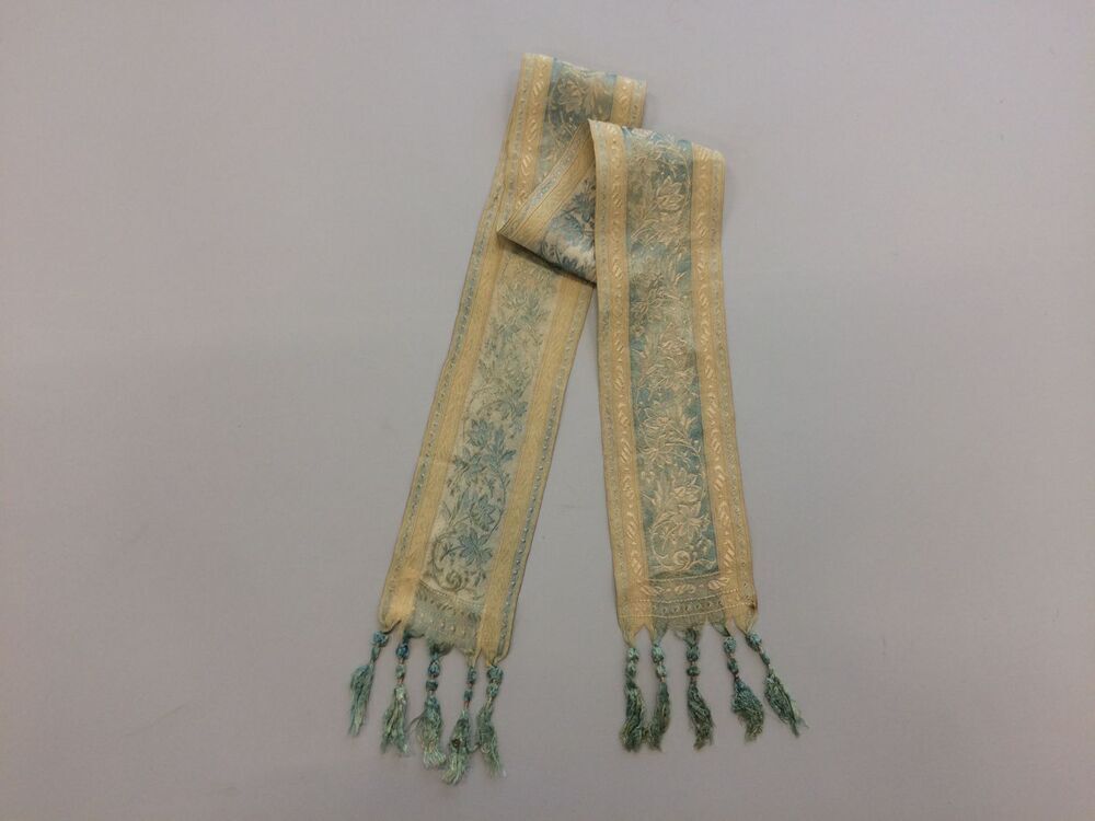 Smal sjaaltje in zijden jaquardweefsel, met lichtblauwe bloemslinger op crème grond, afgewerkt met kwastjes