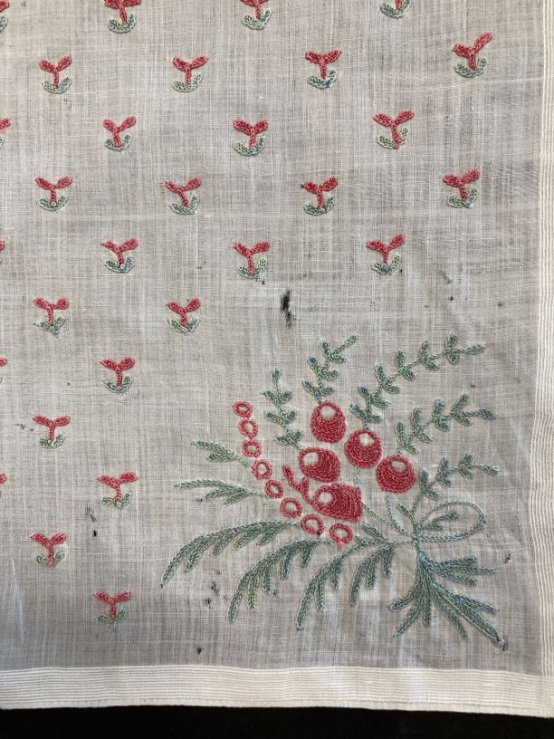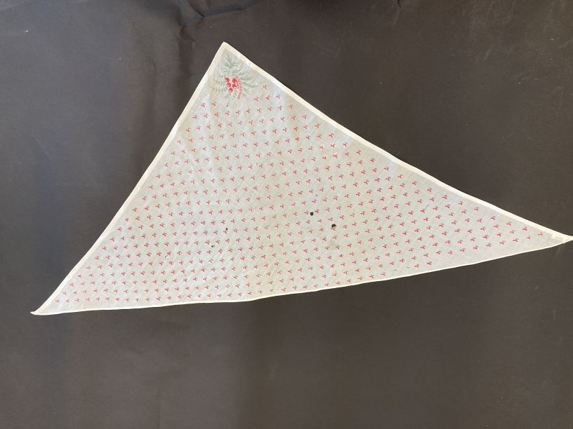 Driekantige doek met simpel strooimotiefje en boeketje in de punt, rood en groen tamboereerwerk,