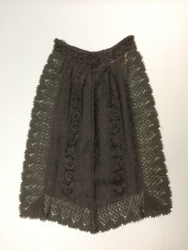 Schortje van zwart damast en satijn, rondom machinaal kant en met kralenborduursel met kralen