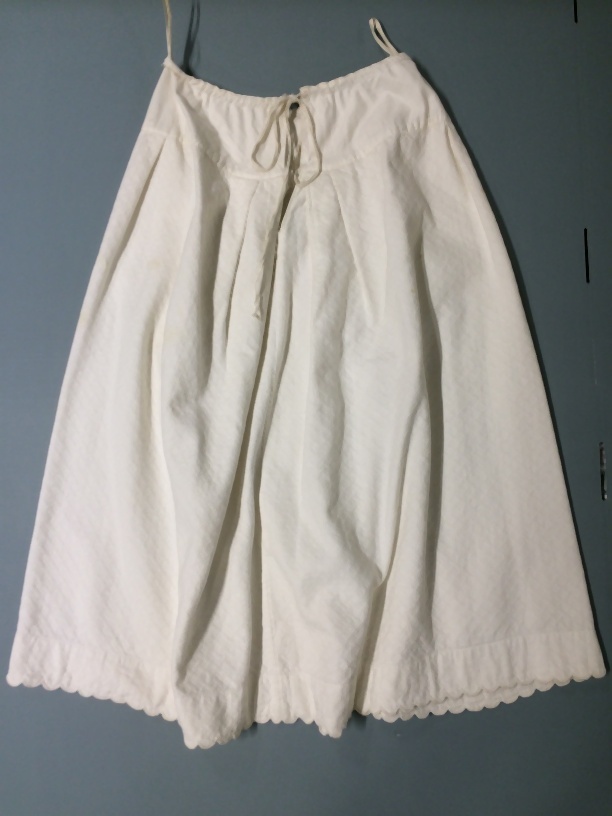Onderrok van wit piqué met vlechtmotief, aan heupstuk van wit katoen, geschulpte zoom