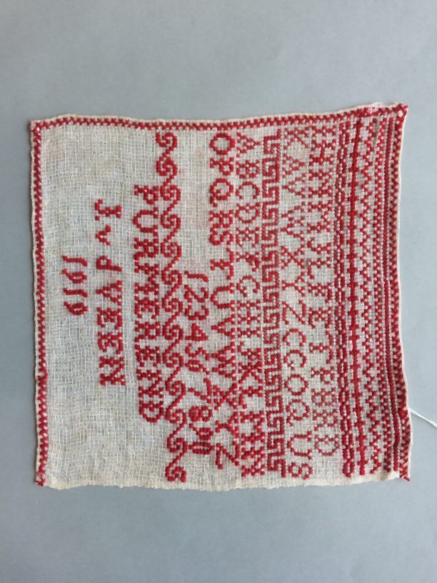 Lettermerklap, katoenen stramien, kruissteek in rood, vijf randen, tweemaal alfabet, gemerkt PURMEREND, J. V.D. VEEN