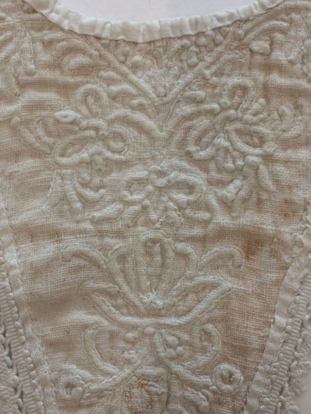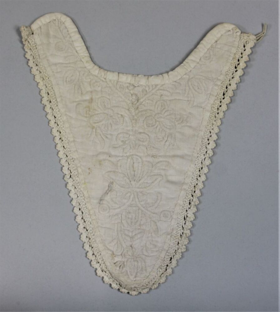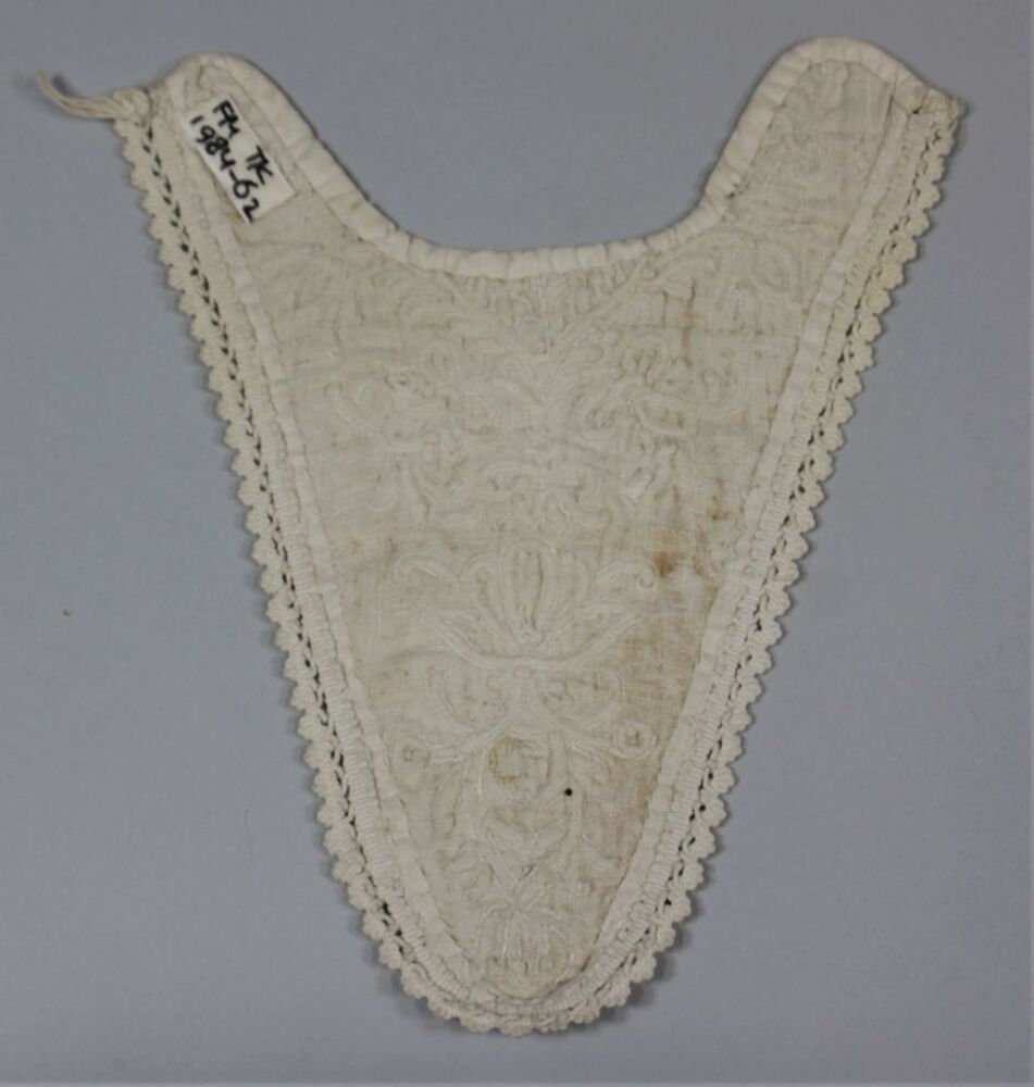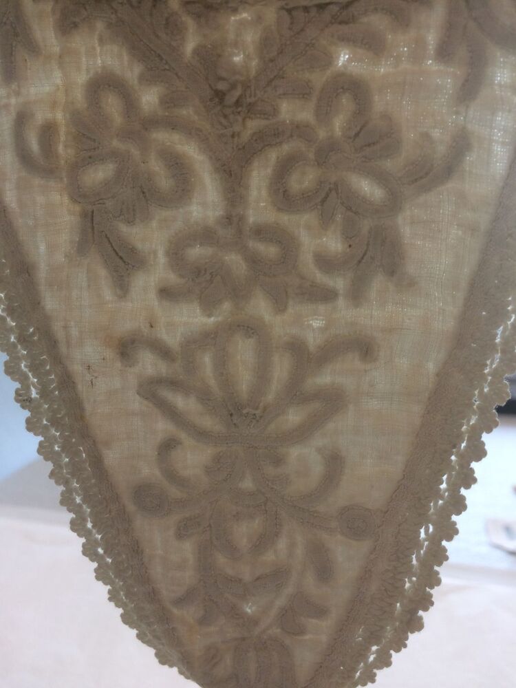 V-vormig befje van Zaans stikwerk, gemaakt van stomacher