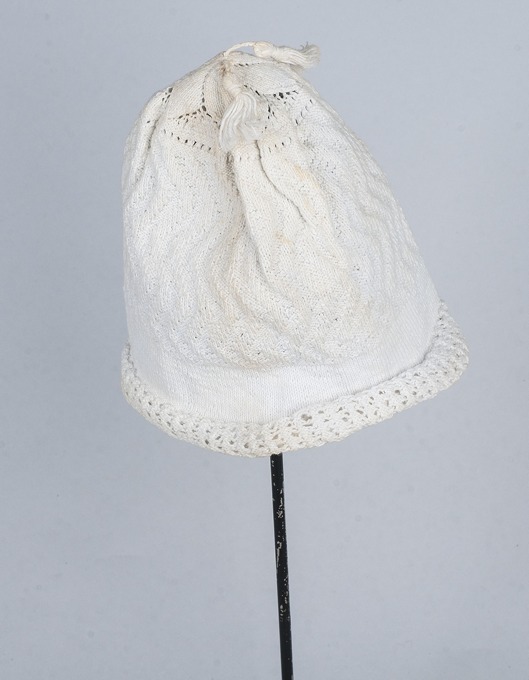 Slaapmuts jongen, gebreid van dun wit katoen, met ingebreid motief, zigzag, onderdeel van groep van twee